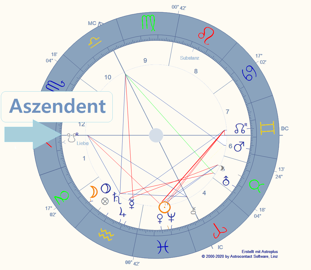 Die Qualitäten des Aszendenten sind instinktiv und tief in der Physis verankert. Deshalb prägt der Aszendent unser Aussehen stark mit. In der nebenstehenden Horoskopgraphik befindet sich der Aszendent im Schützen.